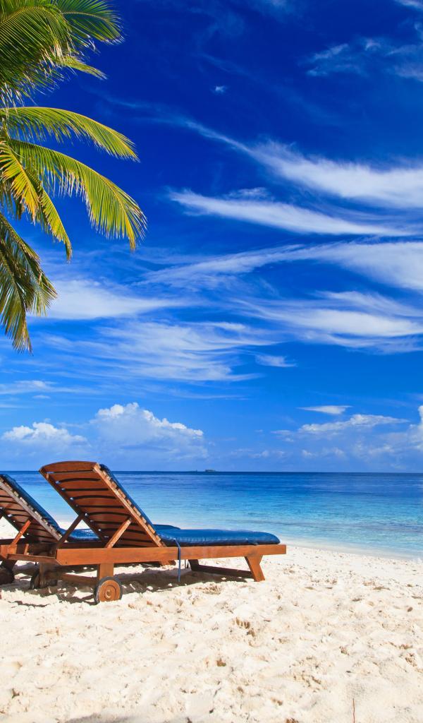 Обои Шезлонги на тропическом пляже под голубым небом
