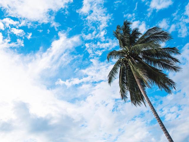 Обои Зеленая пальма на фоне голубого неба с белыми облаками