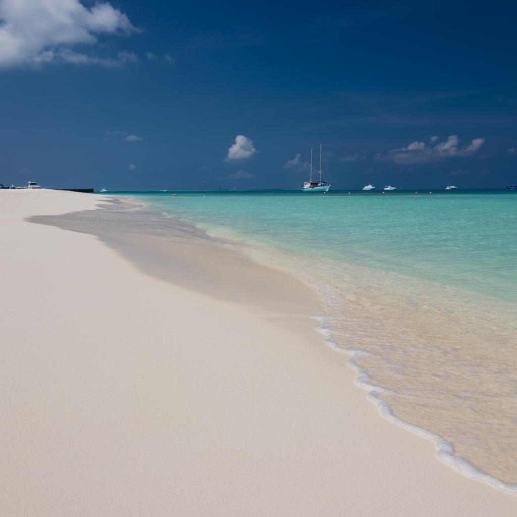 Обои Спокойные волны на белом горячем песке под голубым небом