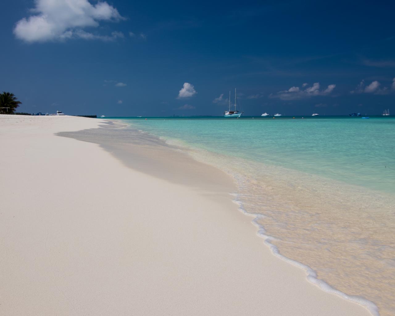 Обои Спокойные волны на белом горячем песке под голубым небом