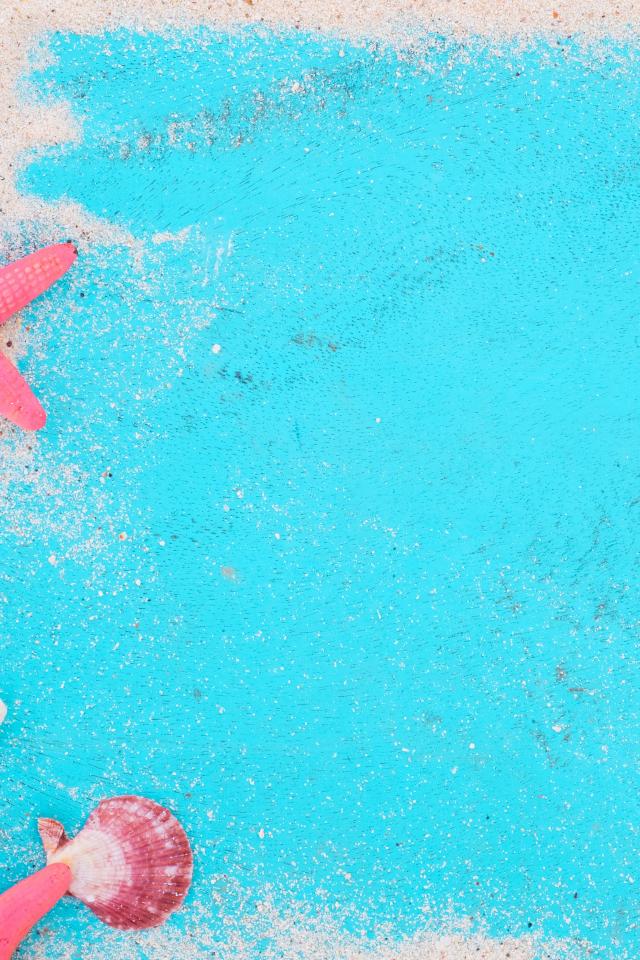 Обои Ракушки и морские звезды с песком на голубом фоне