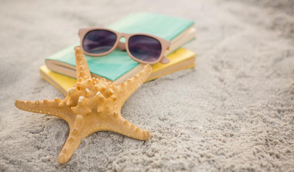 Обои Книги, очки и морская звезда на белом песке