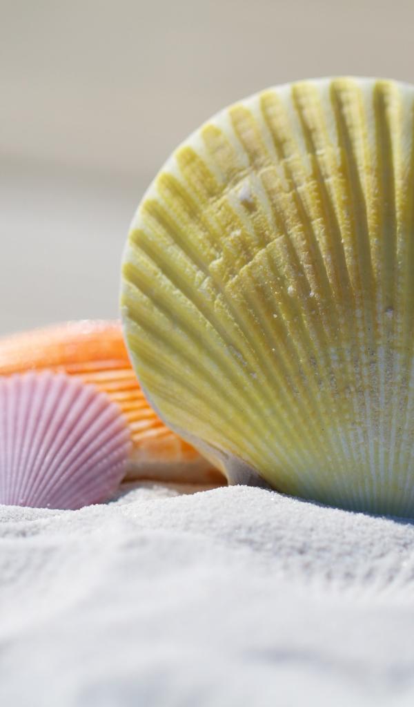 Обои Разноцветные ракушки лежат на белом песке
