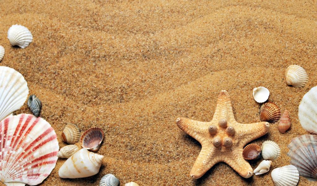 Обои Морская звезда и ракушки лежит на желтом песке