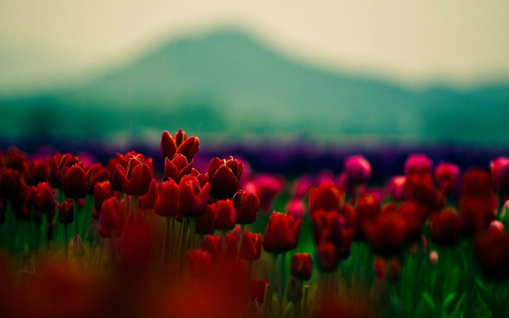 Обои Красные тюльпаны на фоне горы