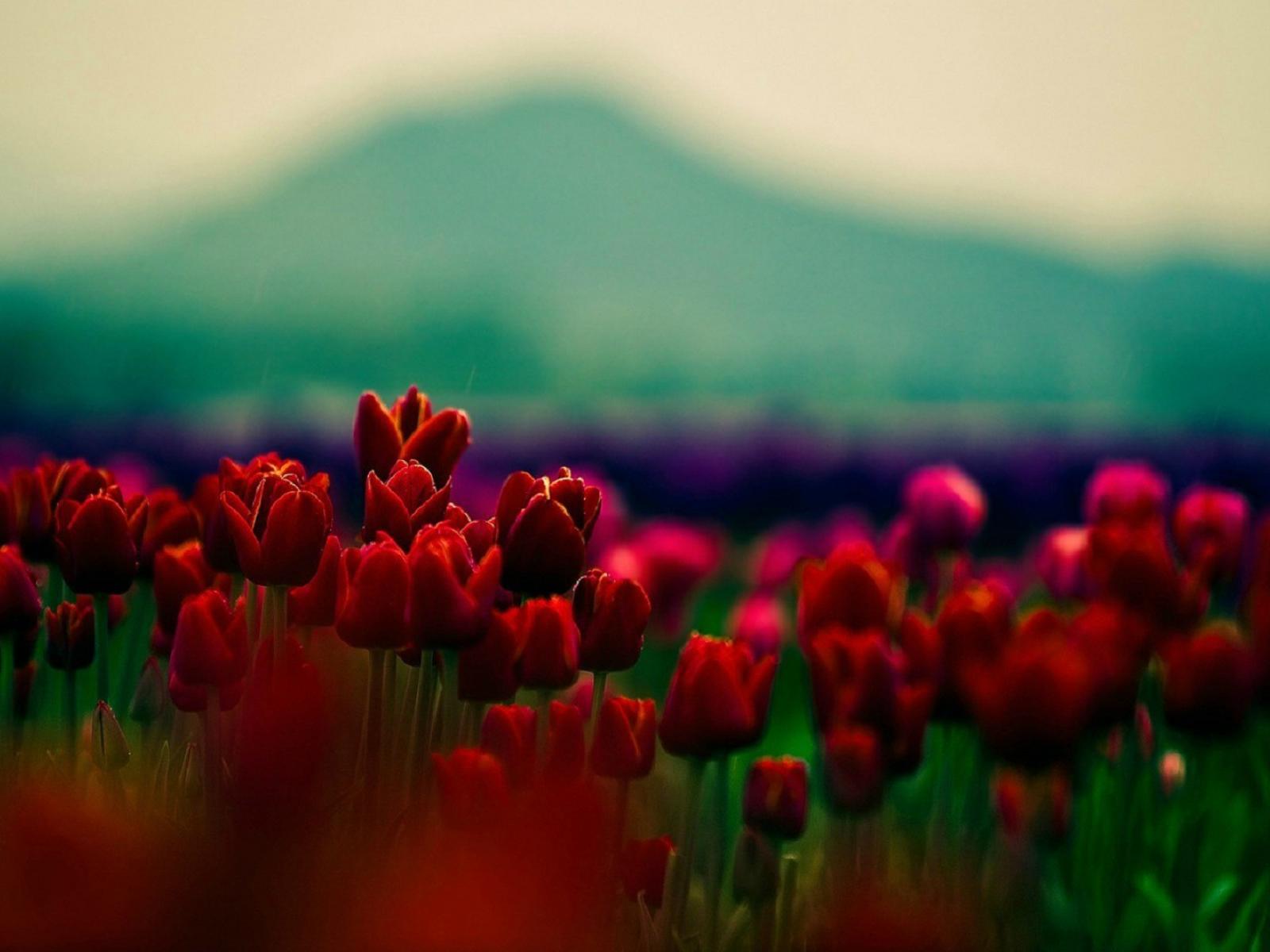 Обои Красные тюльпаны на фоне горы