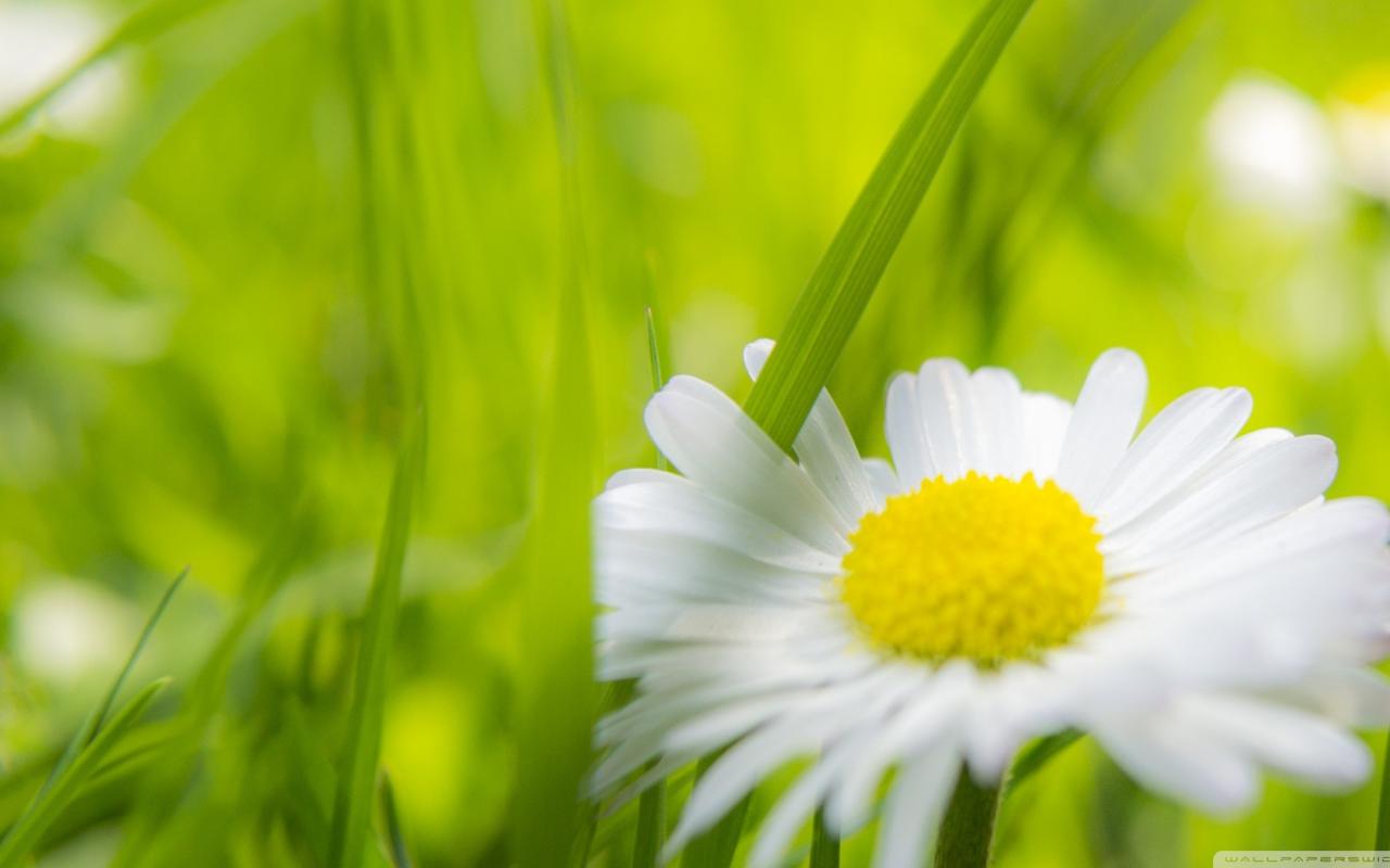 Обои Травинка между лепестками ромашки