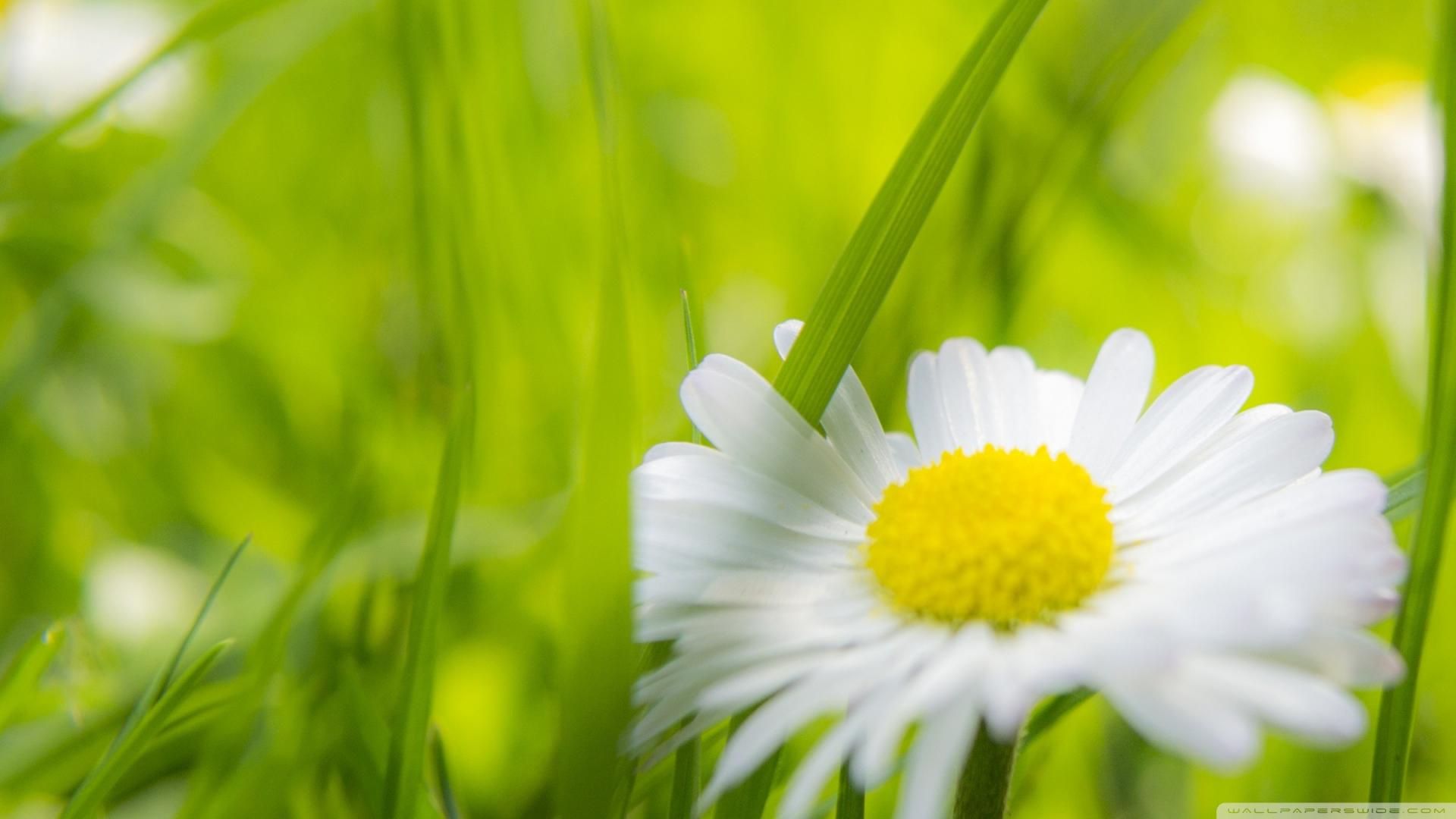 Обои Травинка между лепестками ромашки