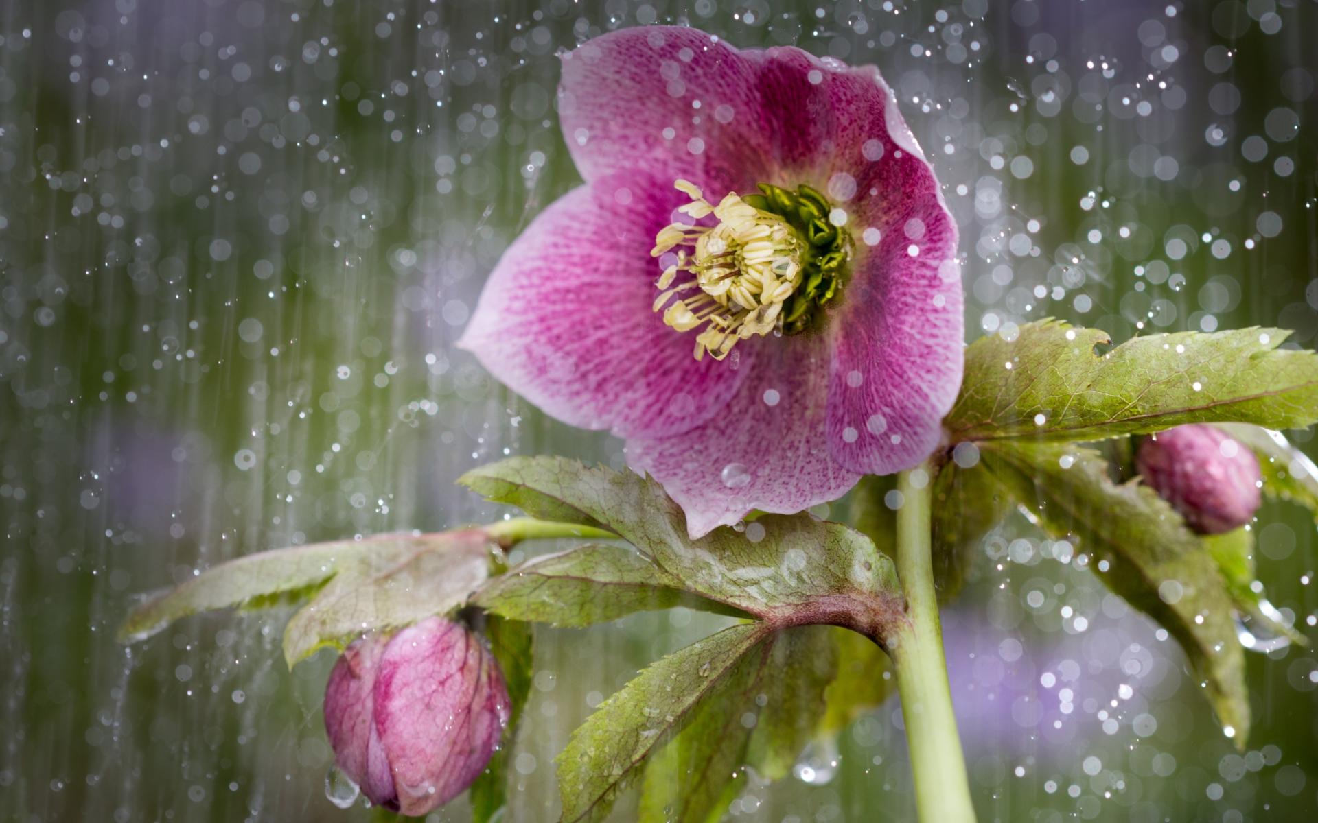 Обои Розовый цветок анемона под дождем