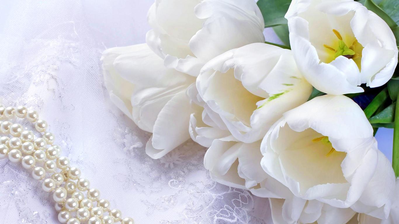 Обои Букет нежных белых тюльпанов и жемчужное ожерелье