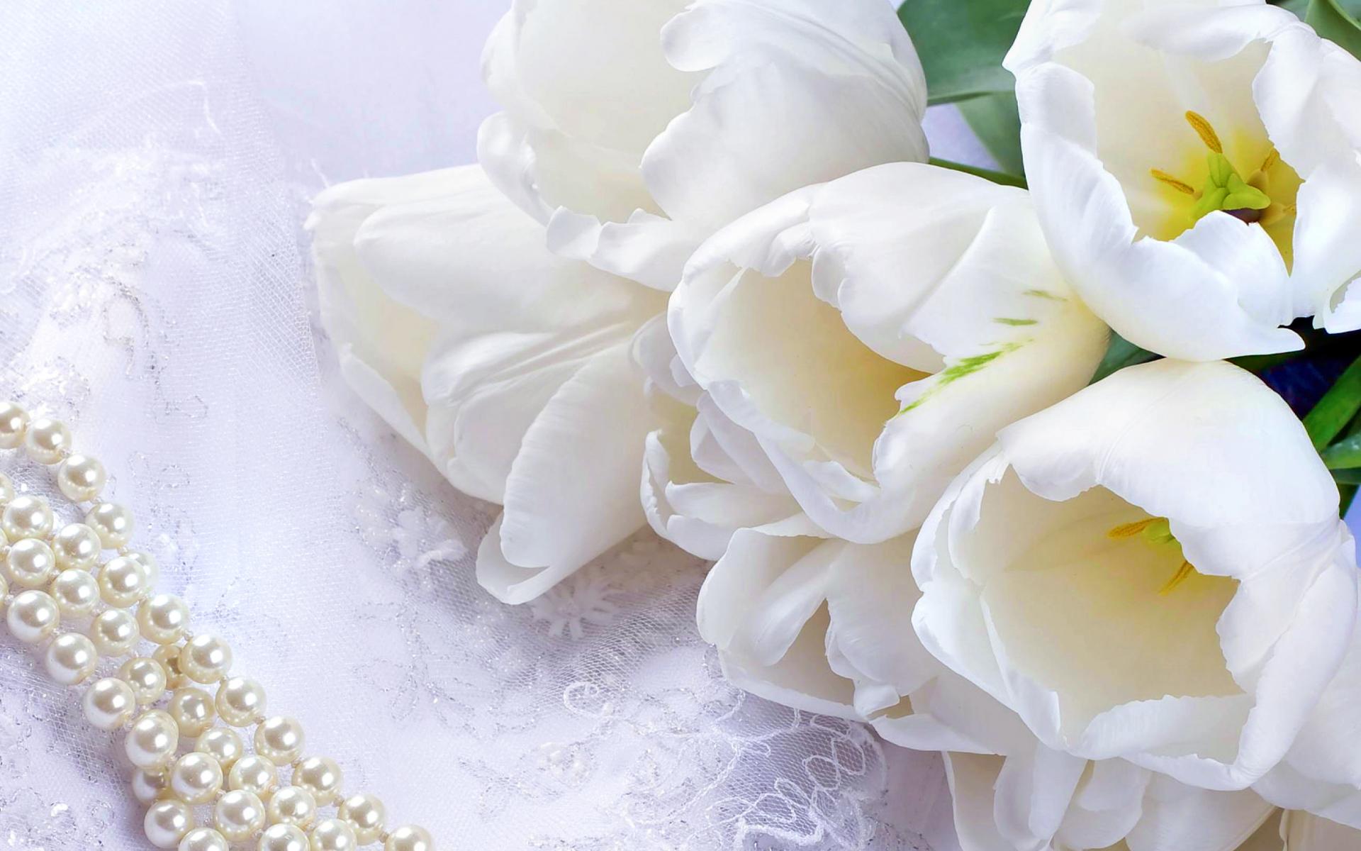 Обои Букет нежных белых тюльпанов и жемчужное ожерелье