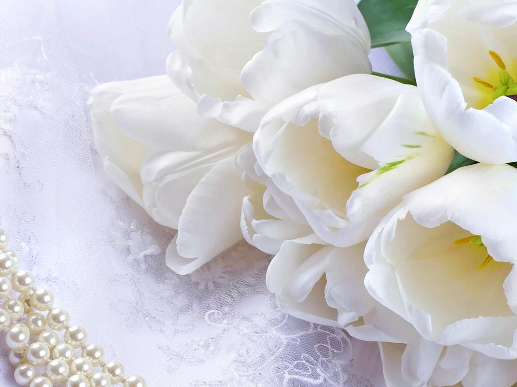 Обои Букет нежных белых тюльпанов и жемчужное ожерелье
