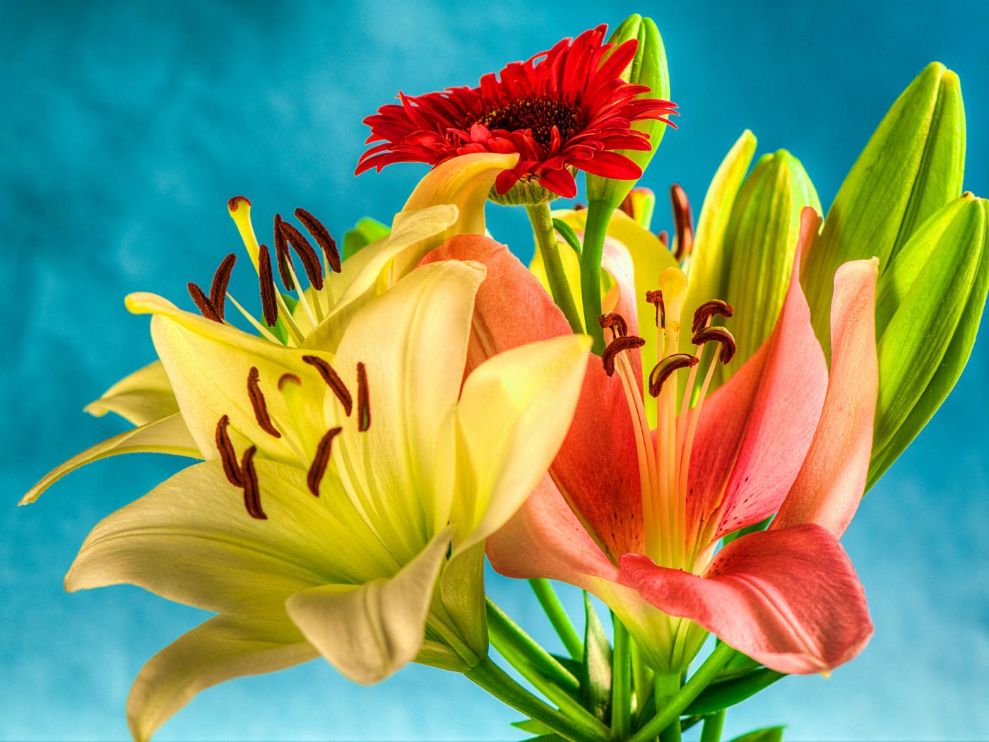 Обои Букет из лилий и гербер на голубом фоне