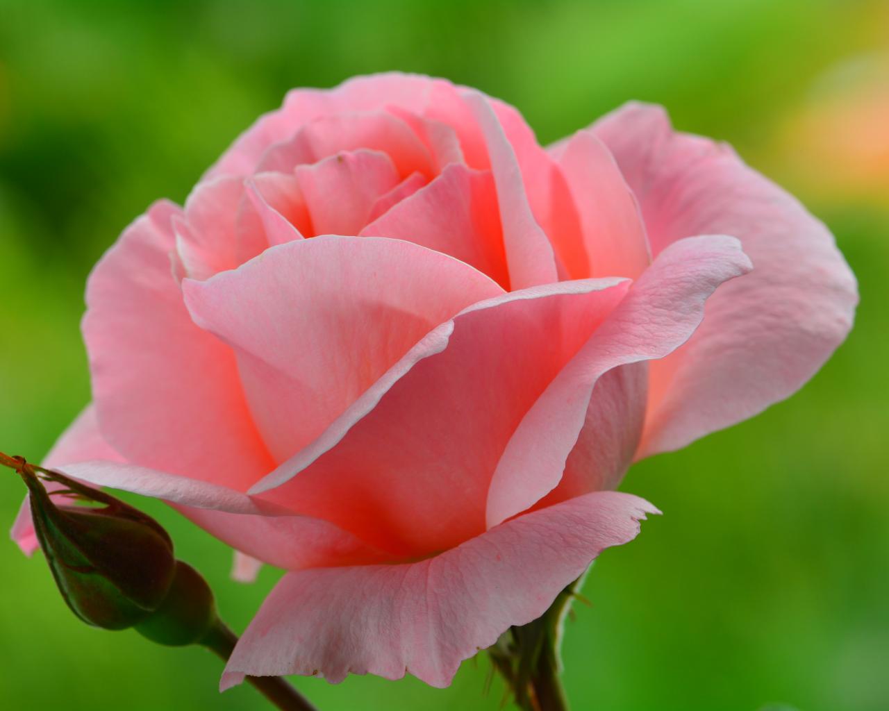 Обои Красивая нежная розовая роза в лучах солнца на клумбе