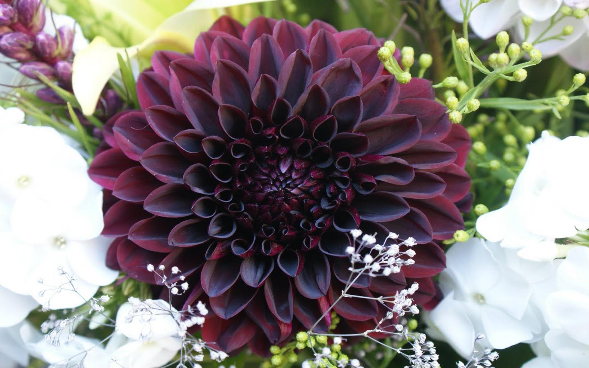 Обои Бордовая георгина с белыми цветами в букете