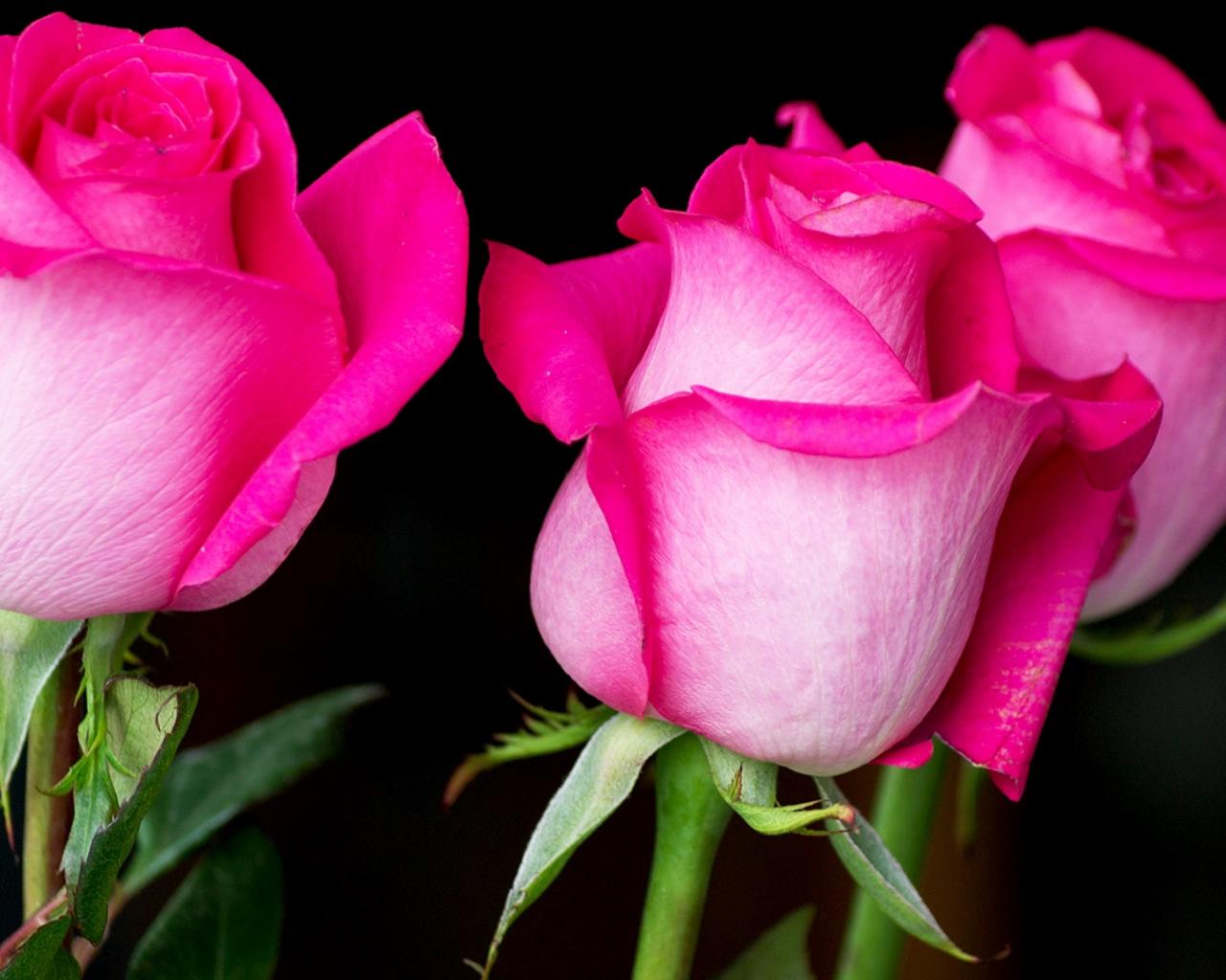 Обои Три красивых розовых розы на черном фоне
