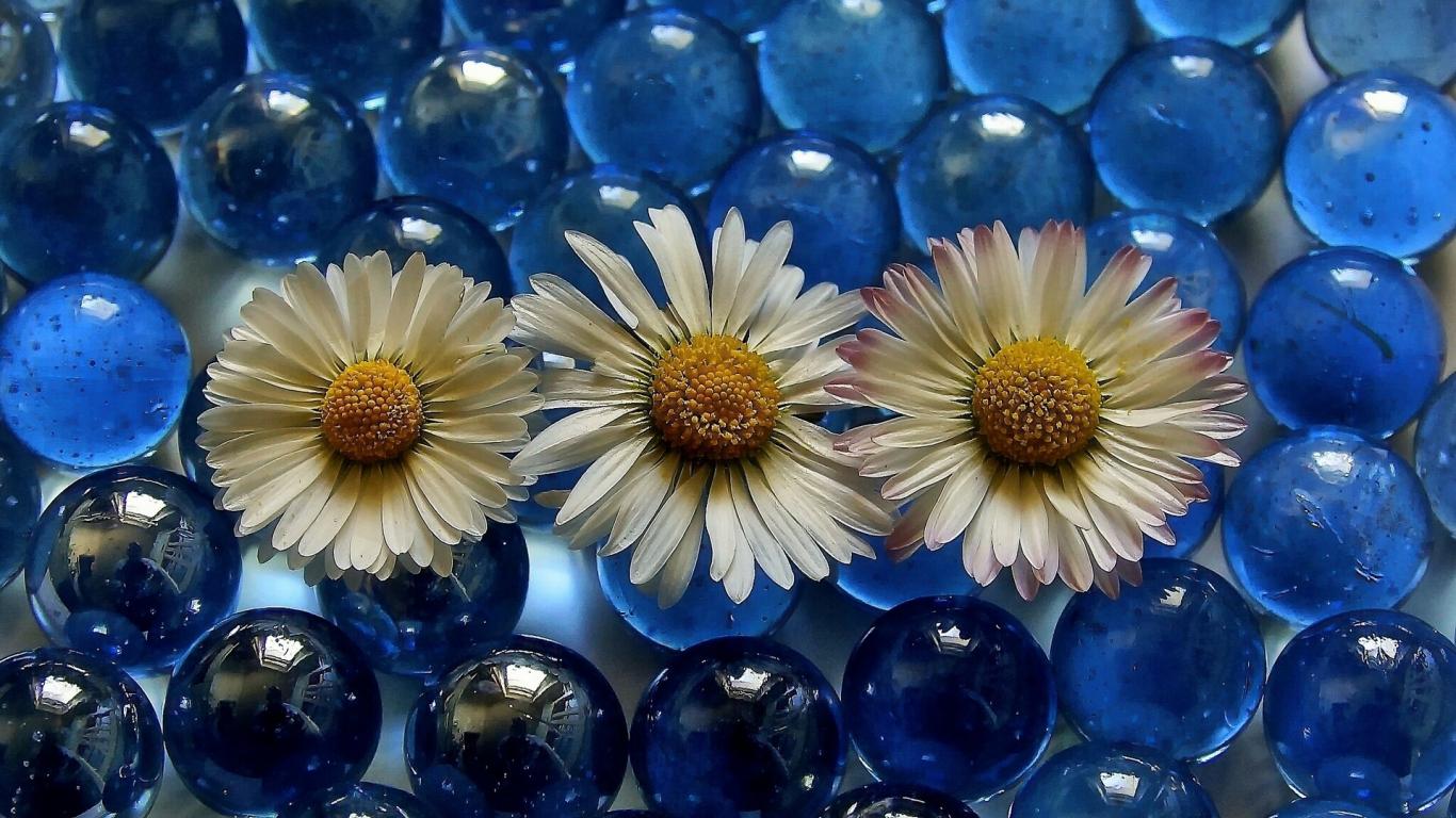 Обои Три белых ромашки на голубых прозрачных шариках