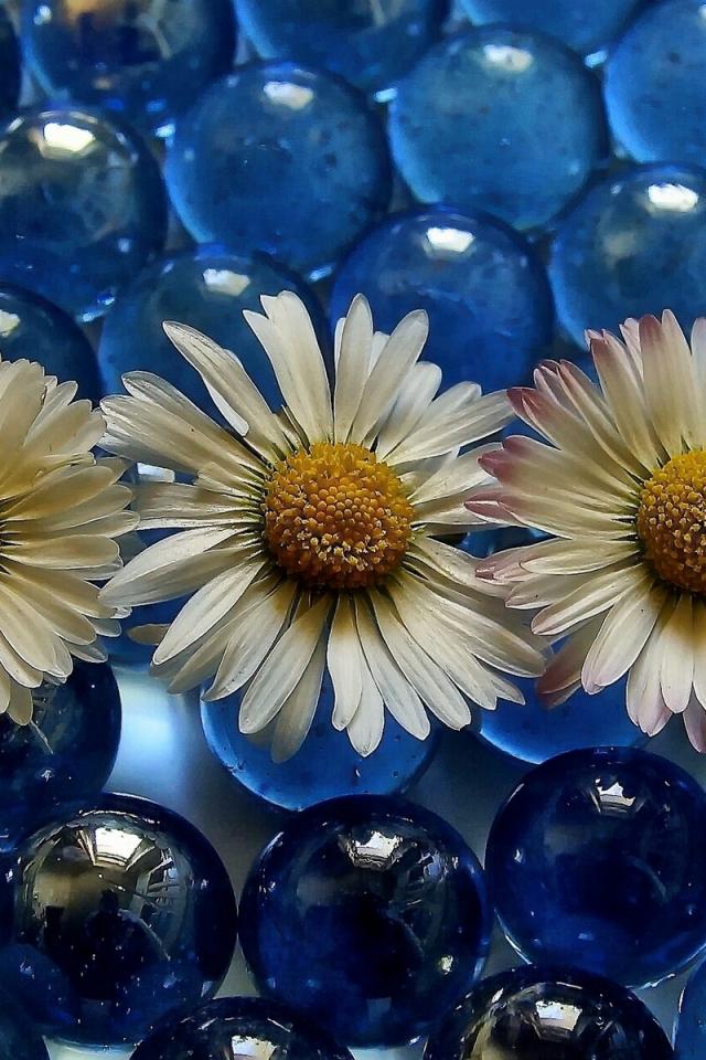 Обои Три белых ромашки на голубых прозрачных шариках
