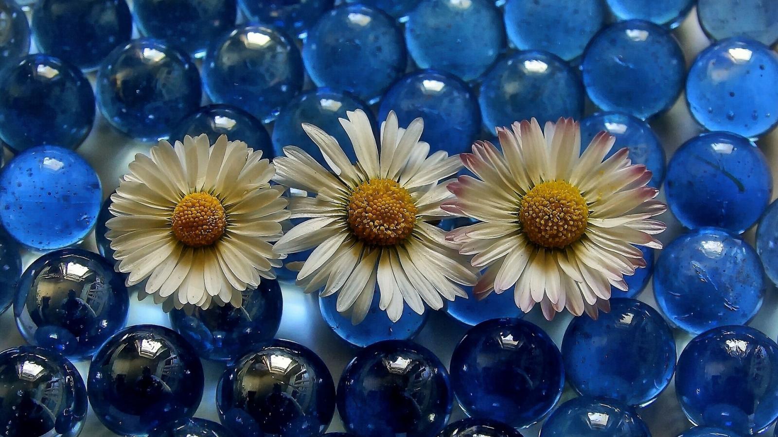 Обои Три белых ромашки на голубых прозрачных шариках