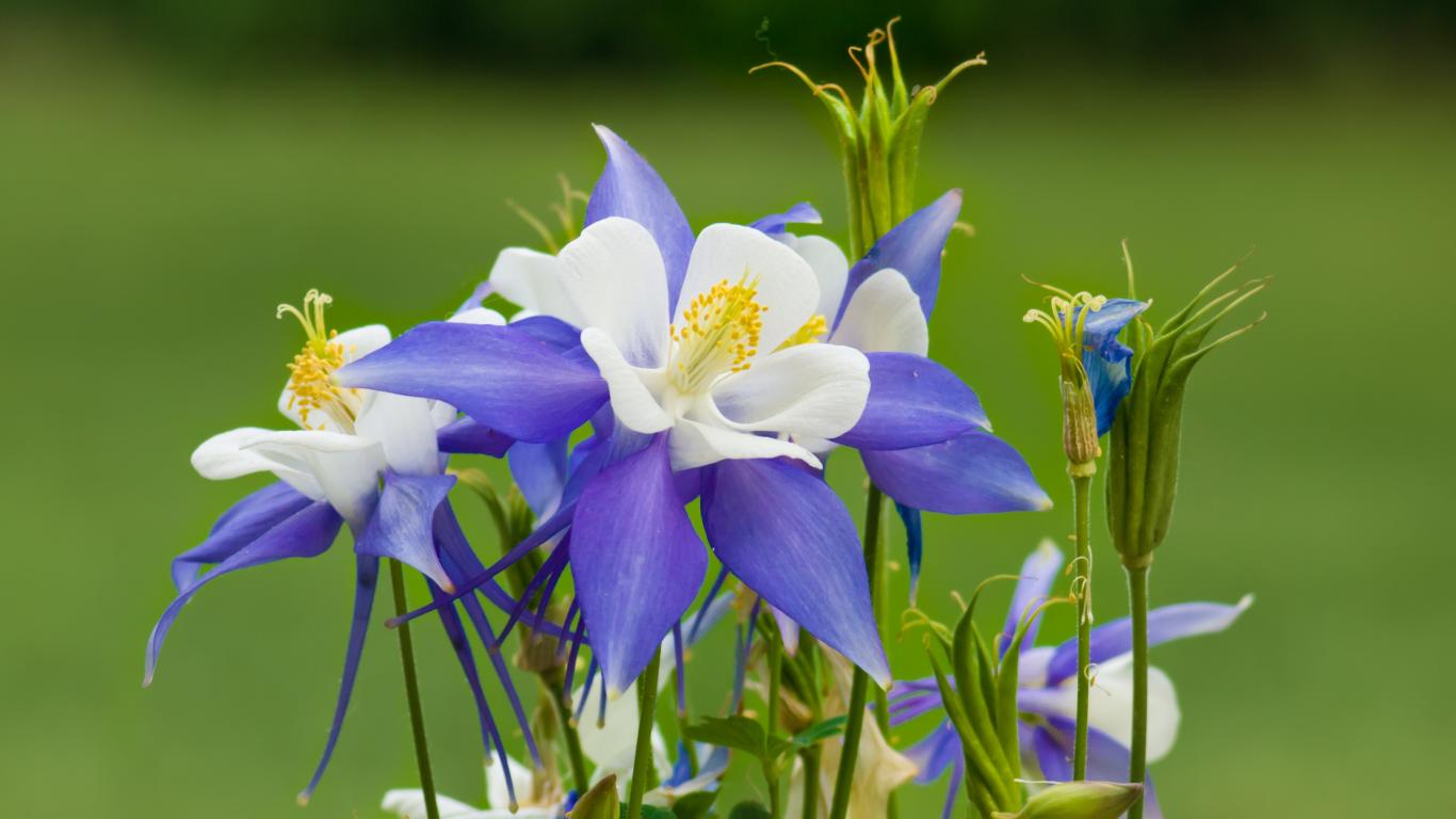 Обои Сиренево- белые цветы водосбор на зеленом фоне