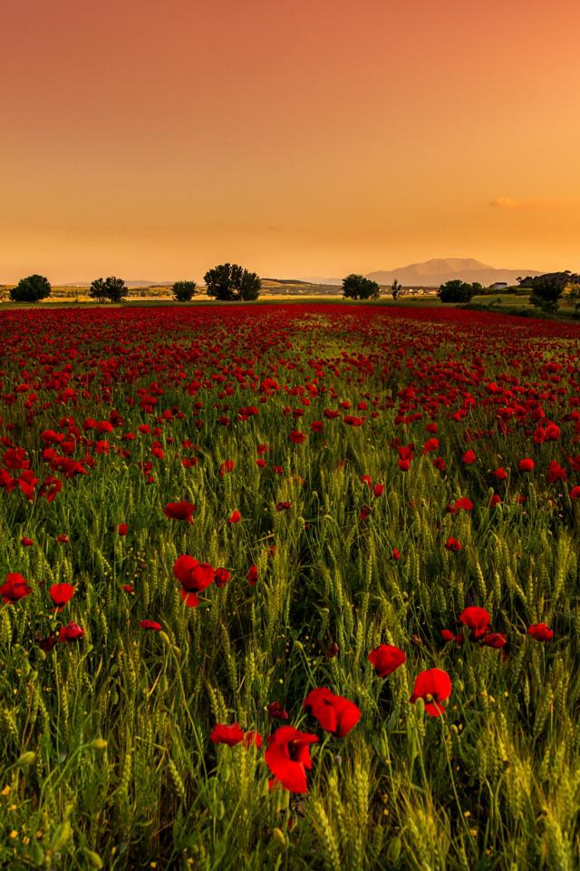 Обои Поле красных маков с зеленой пшеницей