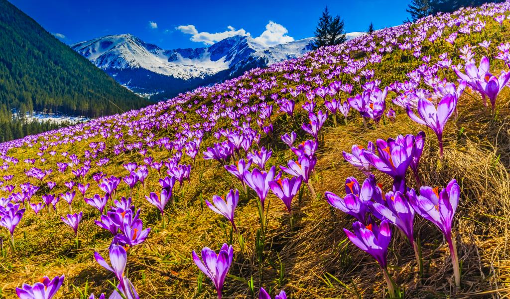 Обои Поляна фиолетовых альпийских крокусов