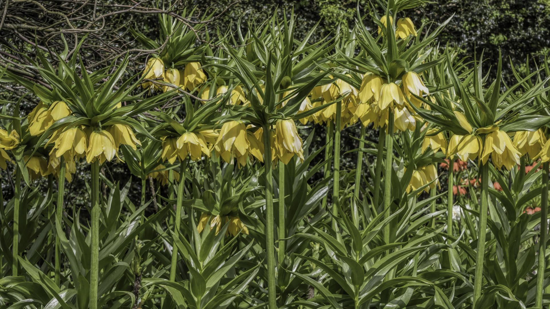 Обои Красивые желтые цветы львиный зев и тюльпаны на клумбе