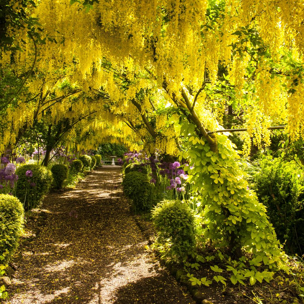 Обои Желтые цветы глициния над тропинкой в парке