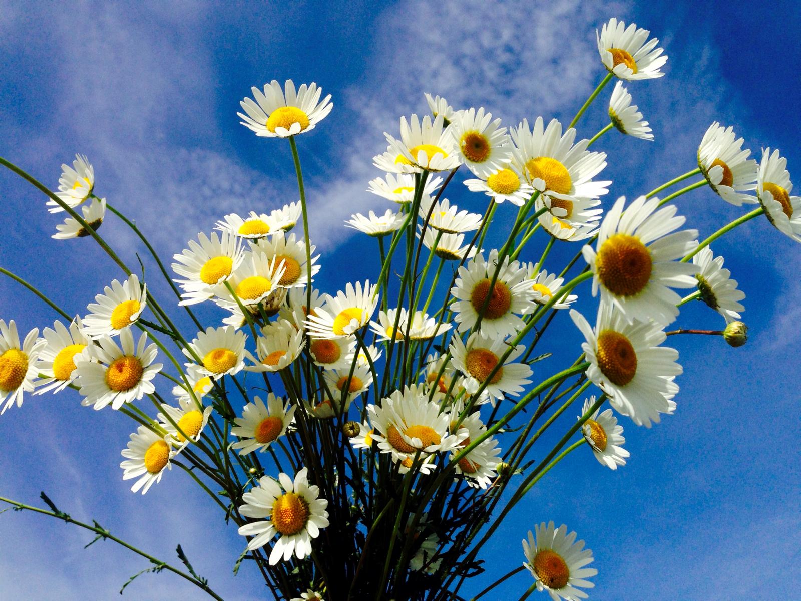 Обои Красивые белые полевые ромашки на фоне голубого неба