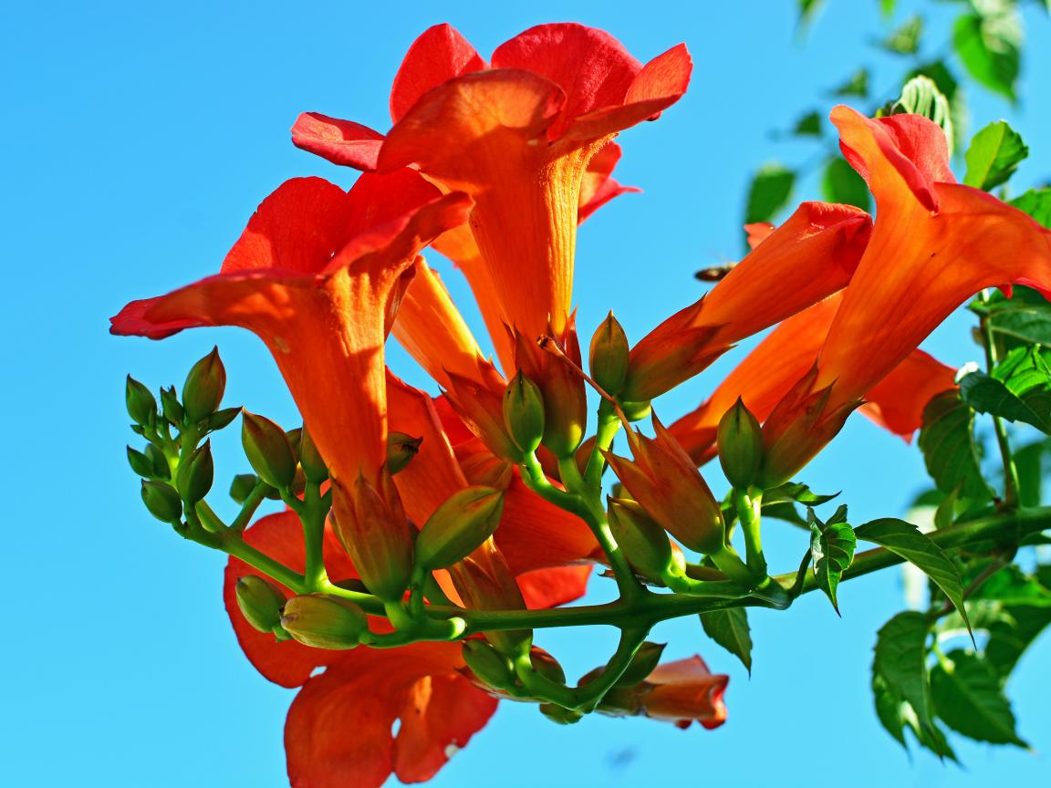 Обои Красивые оранжевые цветы кампсис на голубом фоне
