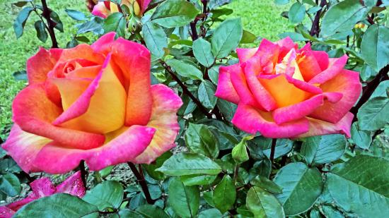 Обои Две красивые розы в саду крупным планом