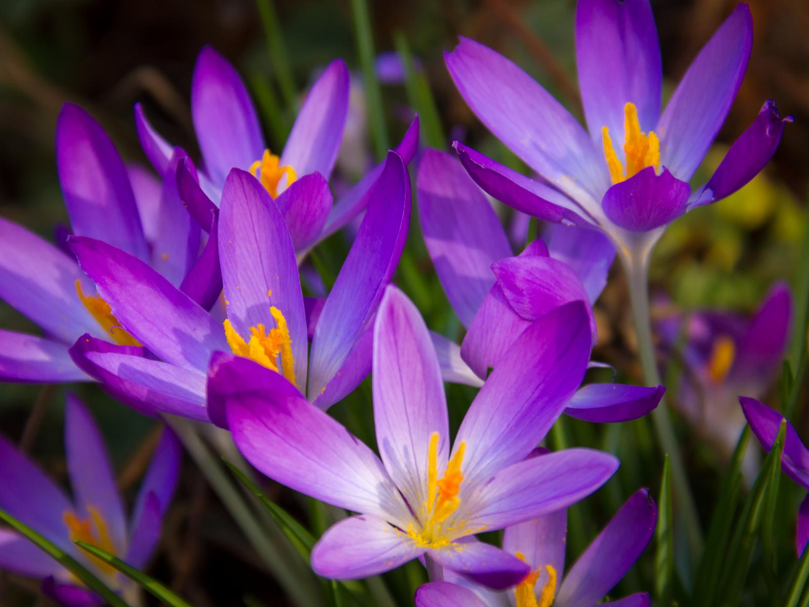 Обои Распустившиеся фиолетовые крокусы крупным планом