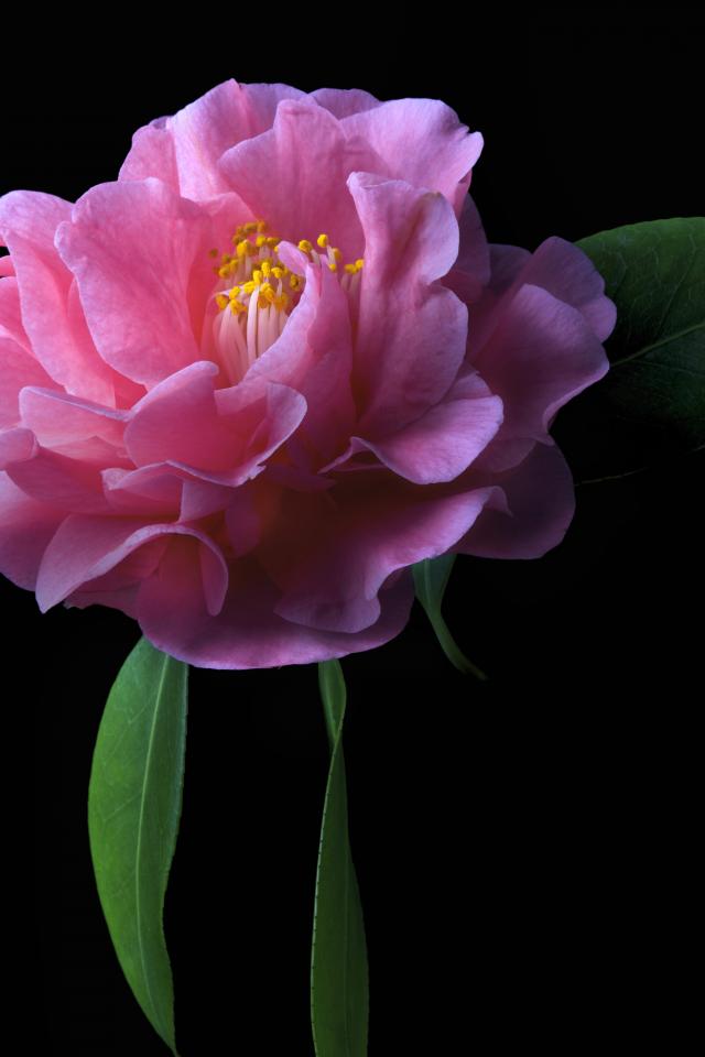 Обои Розовый цветок камелия на черном фоне крупным планом