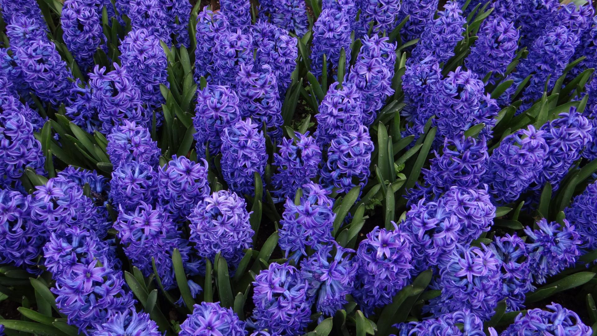 Обои Голубые цветы гиацинты на клумбе крупным планом