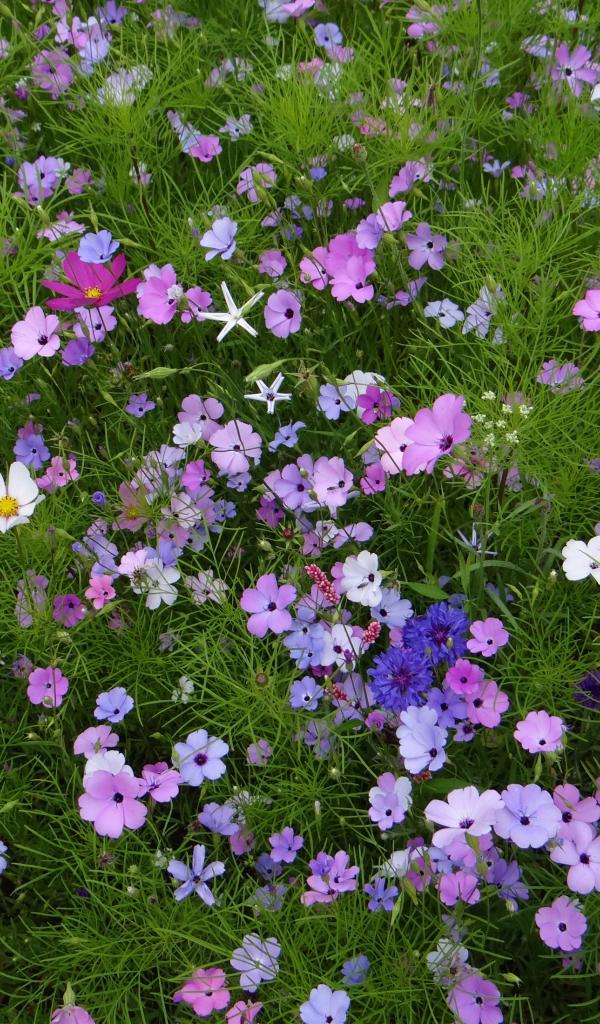 Обои Красивые полевые цветы космея и голубые васильки