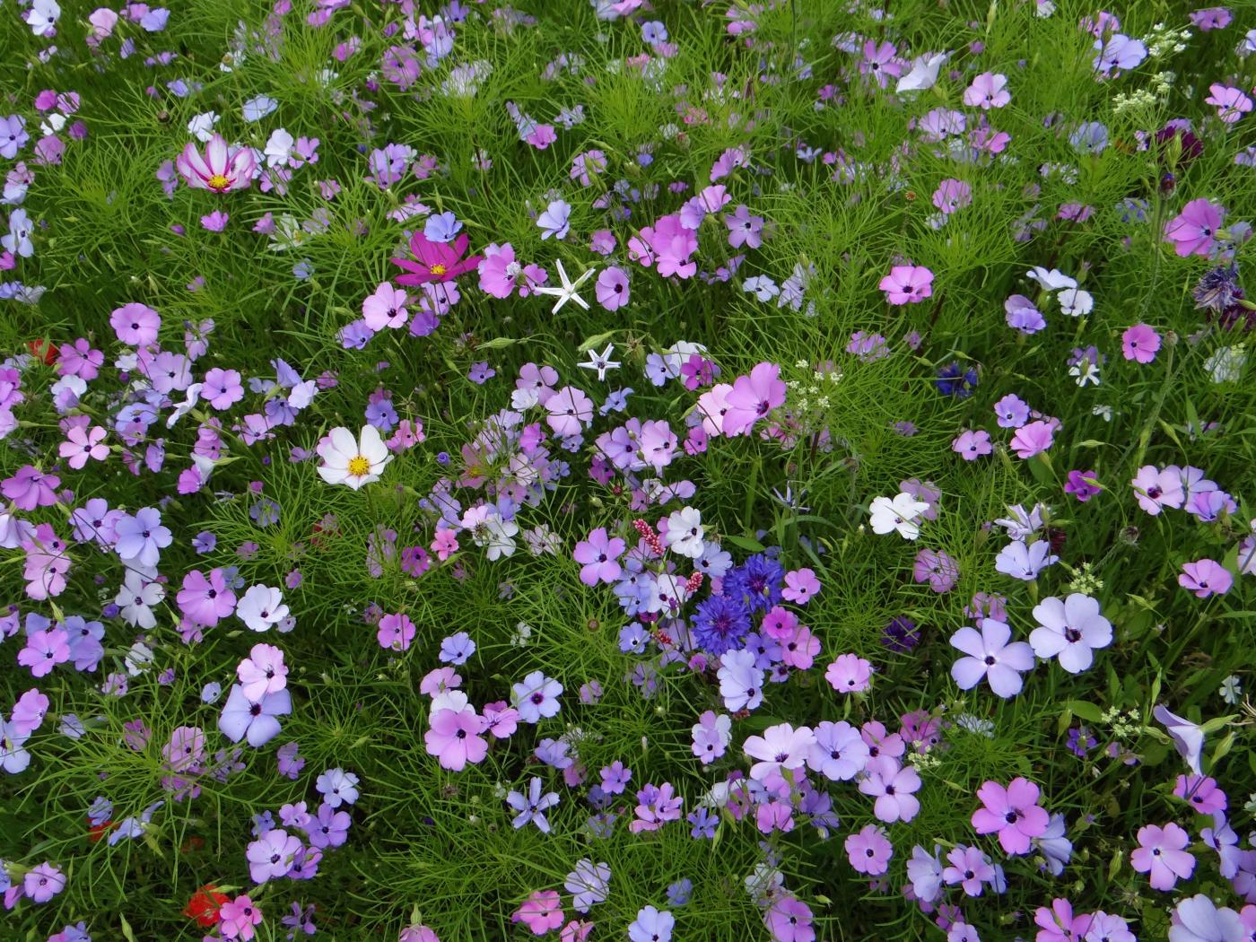 Обои Красивые полевые цветы космея и голубые васильки