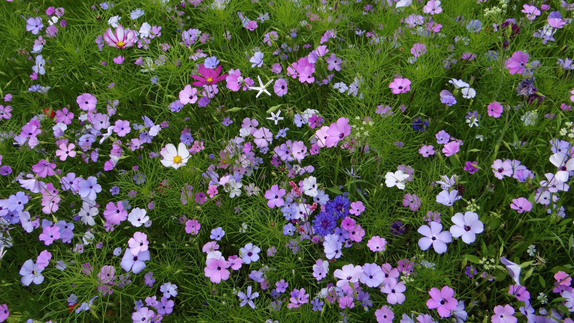 Обои Красивые полевые цветы космея и голубые васильки