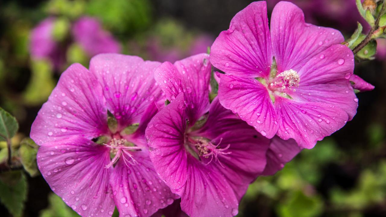 Обои Лиловые цветы мальва в каплях росы