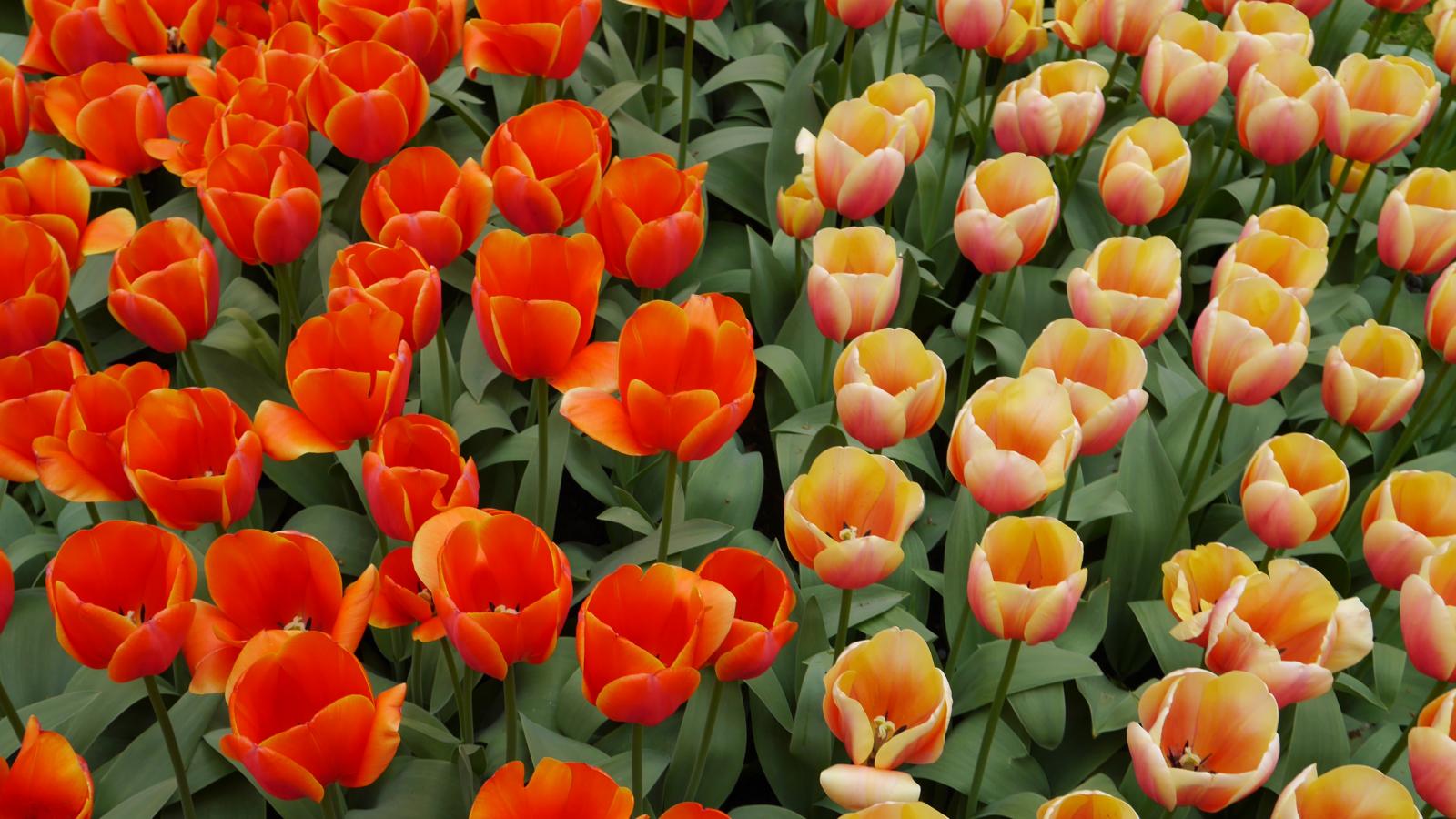 » Обои Оранжевые и персиковые цветы тюльпаны на клумбе