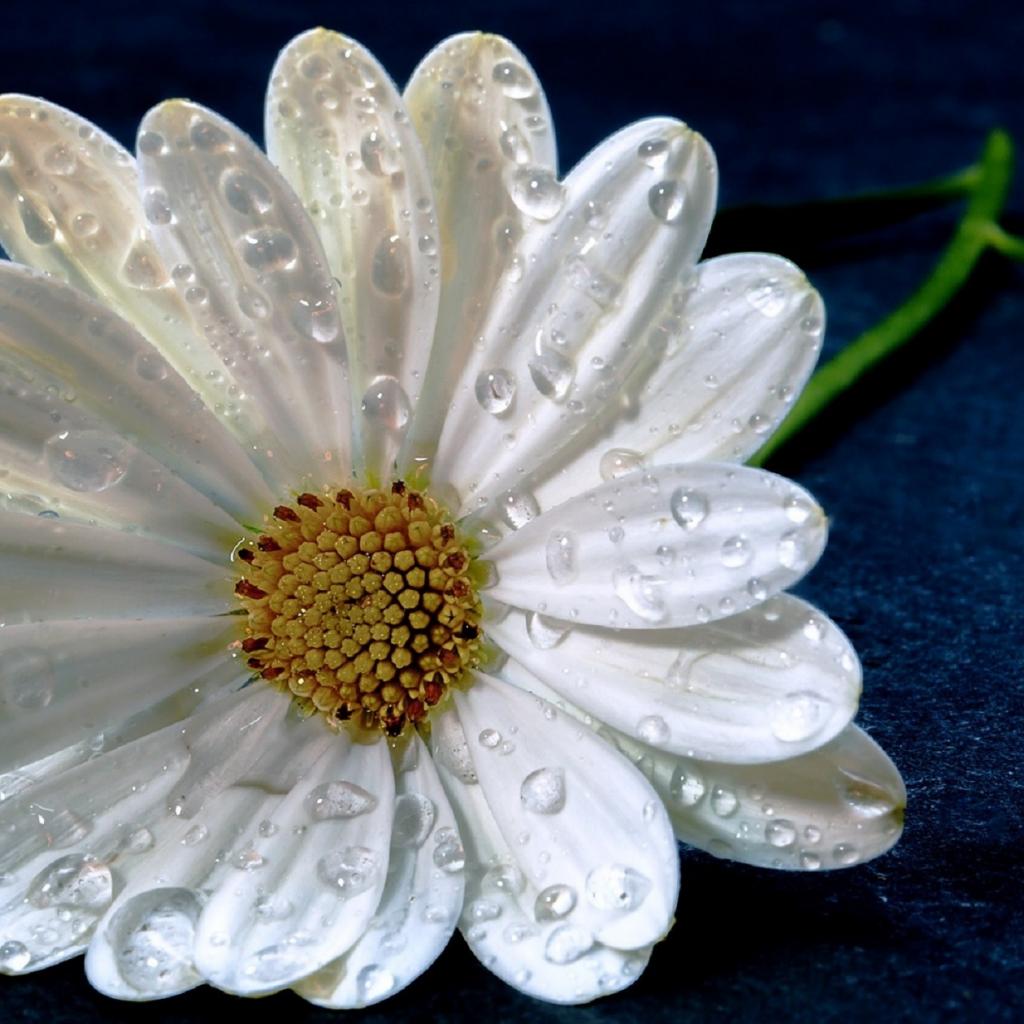 Обои Нежная белая ромашка в капельках росы на синем фоне