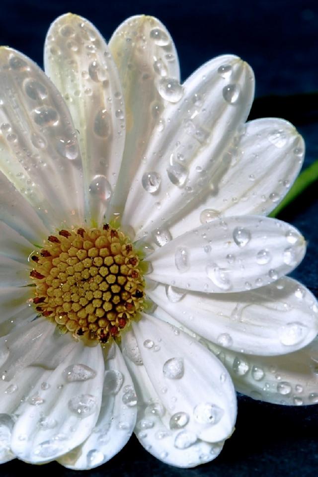 Обои Нежная белая ромашка в капельках росы на синем фоне