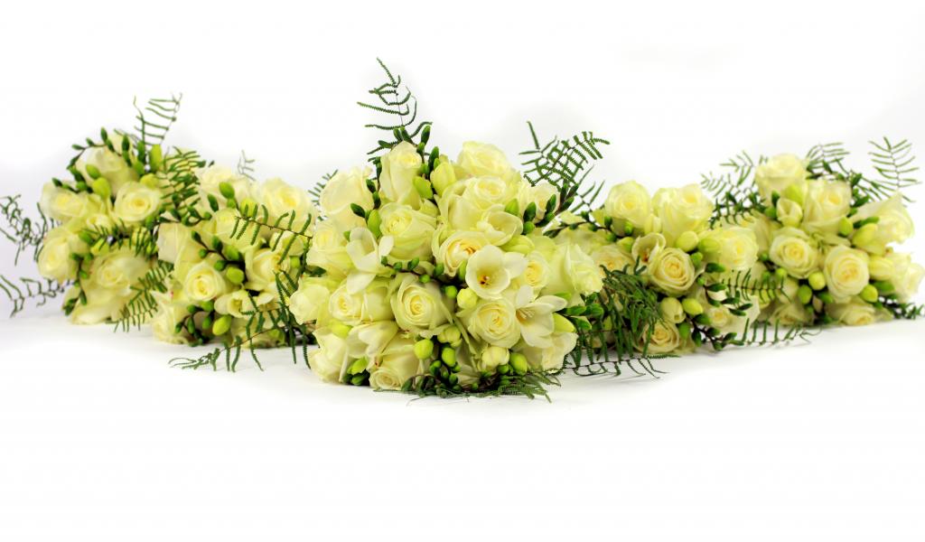 Обои Букеты белых роз и фрезии на белом фоне