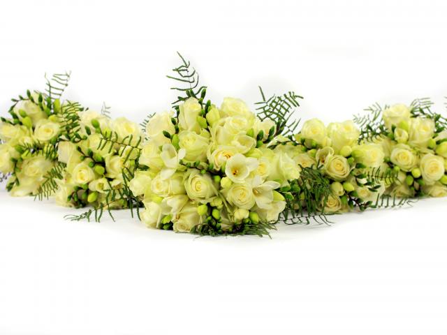 Обои Букеты белых роз и фрезии на белом фоне