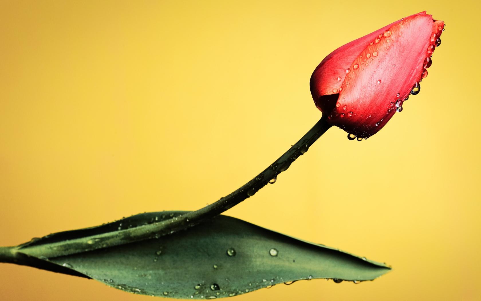 Обои Красный тюльпан с капельками росы на желтом фоне