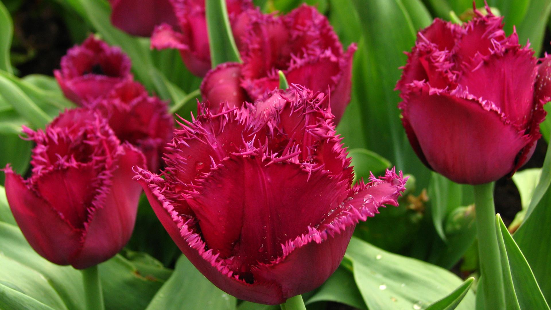 » Обои Бордовые тюльпаны на клумбе в каплях воды крупным планом