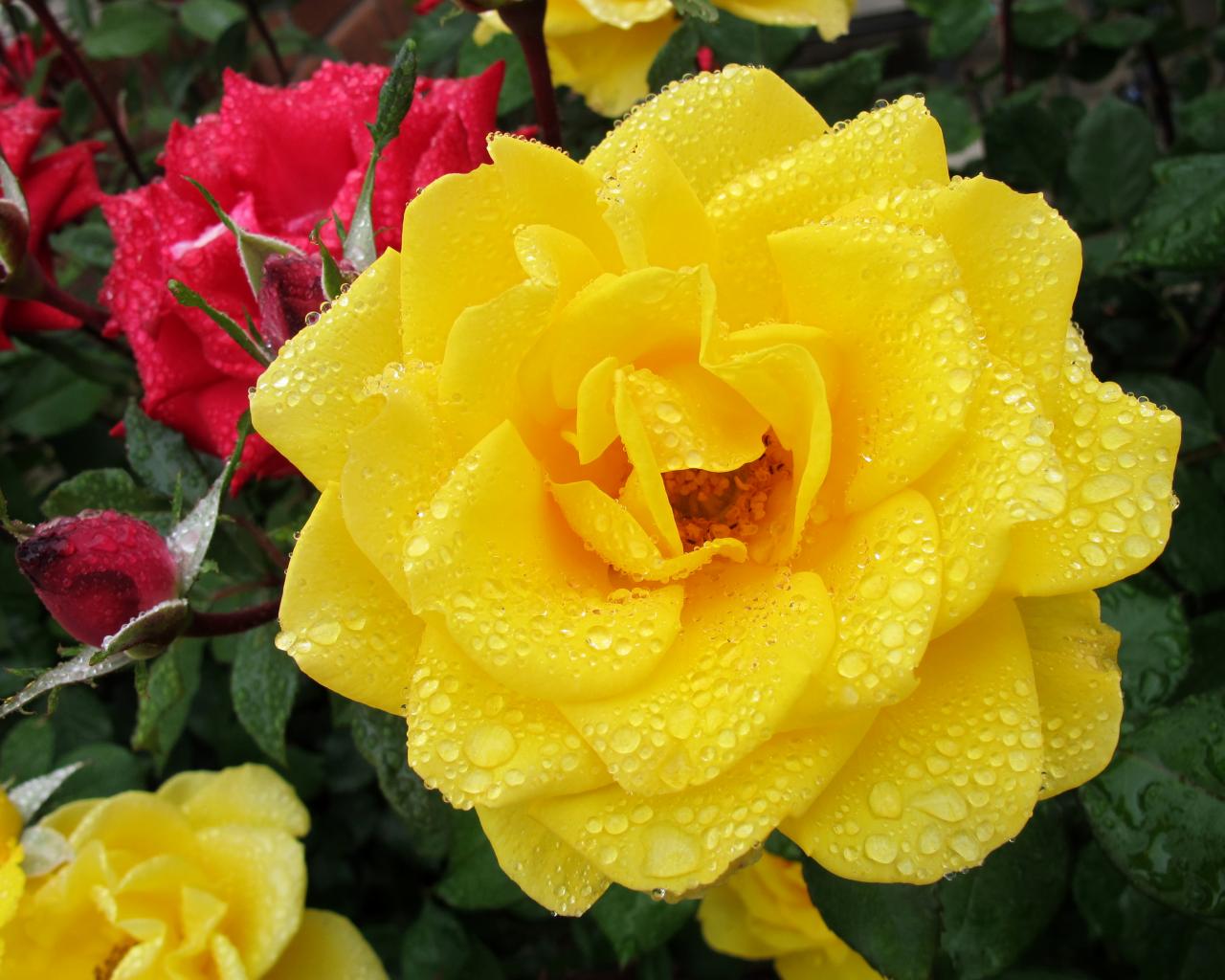 Обои Большая желтая роза в каплях росы крупным планом