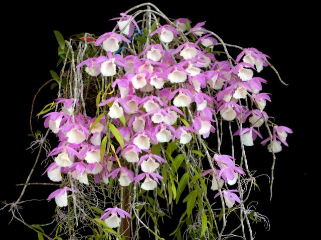 Обои Экзотические розово-белые орхидеи на черном фоне