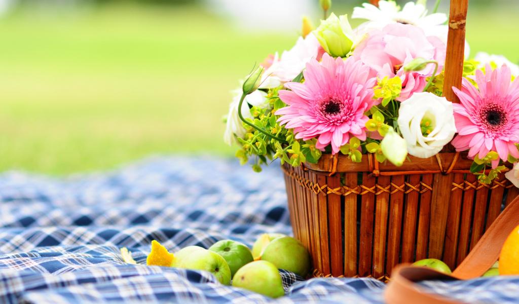 Обои Букет гербер и лютиков в корзине для пикника