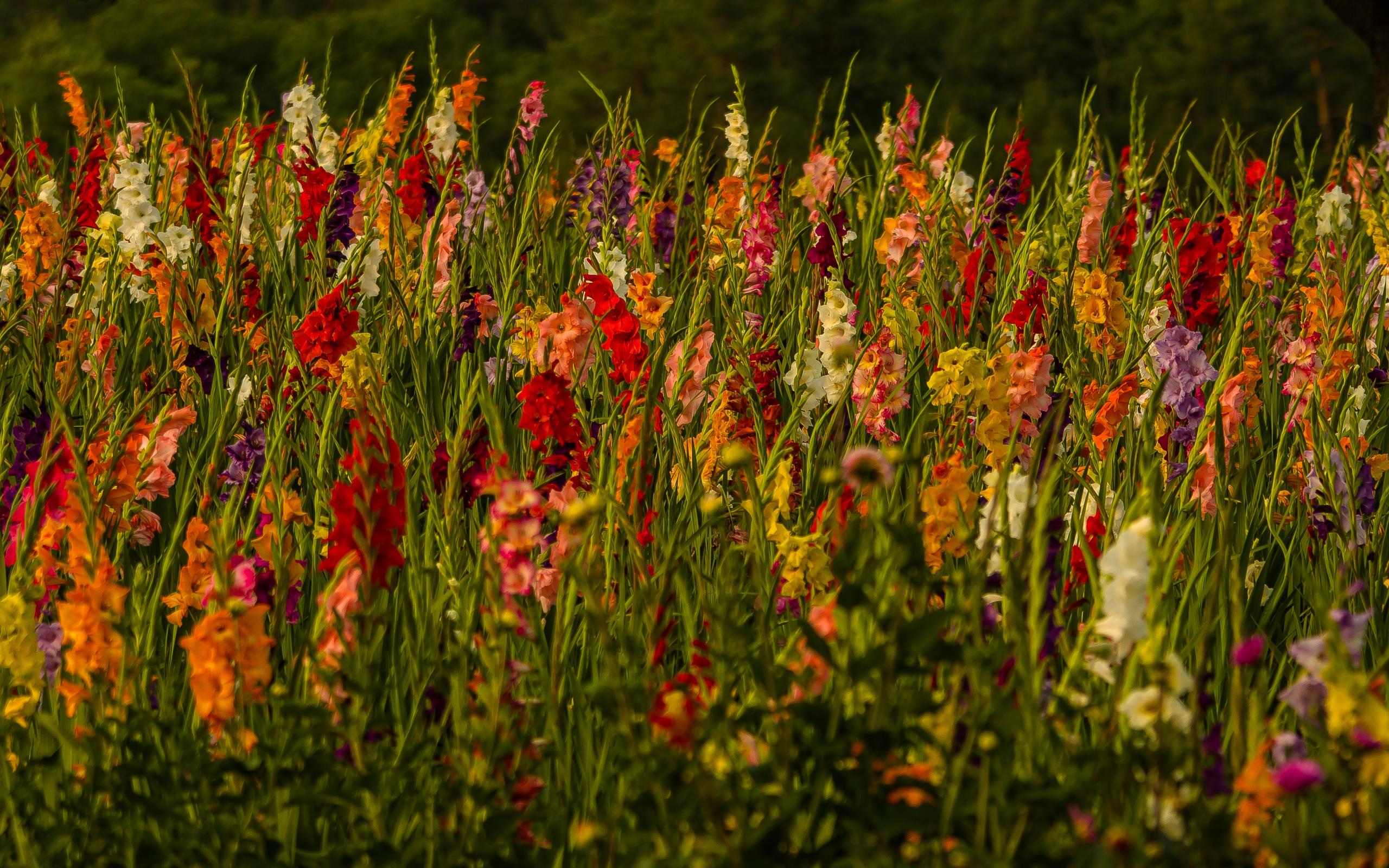 Обои Красивые разноцветные гладиолусы в поле