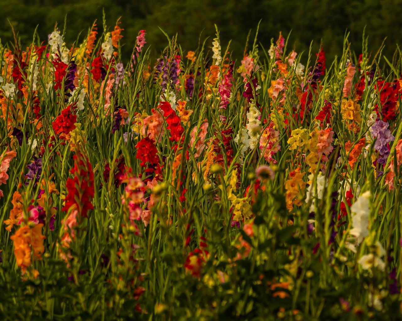 Обои Красивые разноцветные гладиолусы в поле